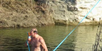 Αψηφώντας το κρύο, πιστοί βούτηξαν στα παγωμένα νερά του ποταμού για να πιάσουν το Σταυρό.