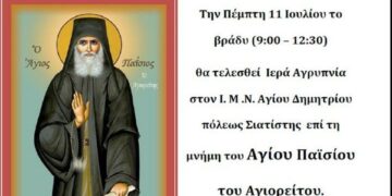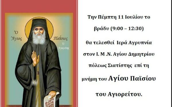 Αγρυπνία στον Άγιο Δημήτριο Σιάτιστας για τον Άγιο Παΐσιο