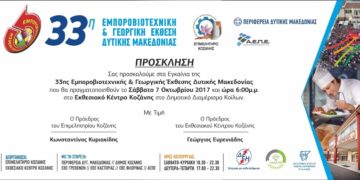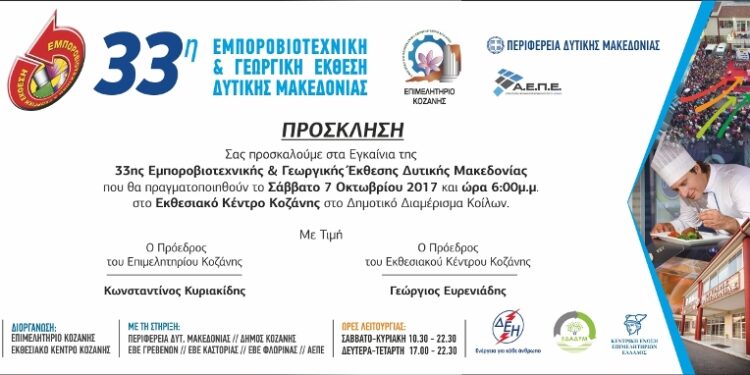 Από το Επιμελητήριο Κοζάνης και το Εκθεσιακό Κέντρο Κοζάνης ανακοινώνεται ότι τα Εγκαίνια της 33ης Εμποροβιοτεχνικής & Γεωργικής Έκθεσης Δυτικής Μακεδονίας θα γίνουν στις 6:00μ.μ.