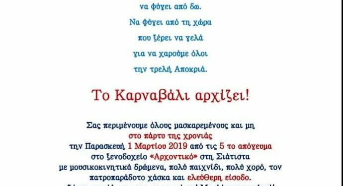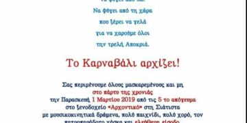 Αποκριάτικο πάρτι από το ΚΔΑΠ Σιάτιστας θα πραγματοποιηθεί την Παρασκευή 1 Μαρτίου στις 5μμ στο ξενοδοχείο Αρχοντικό