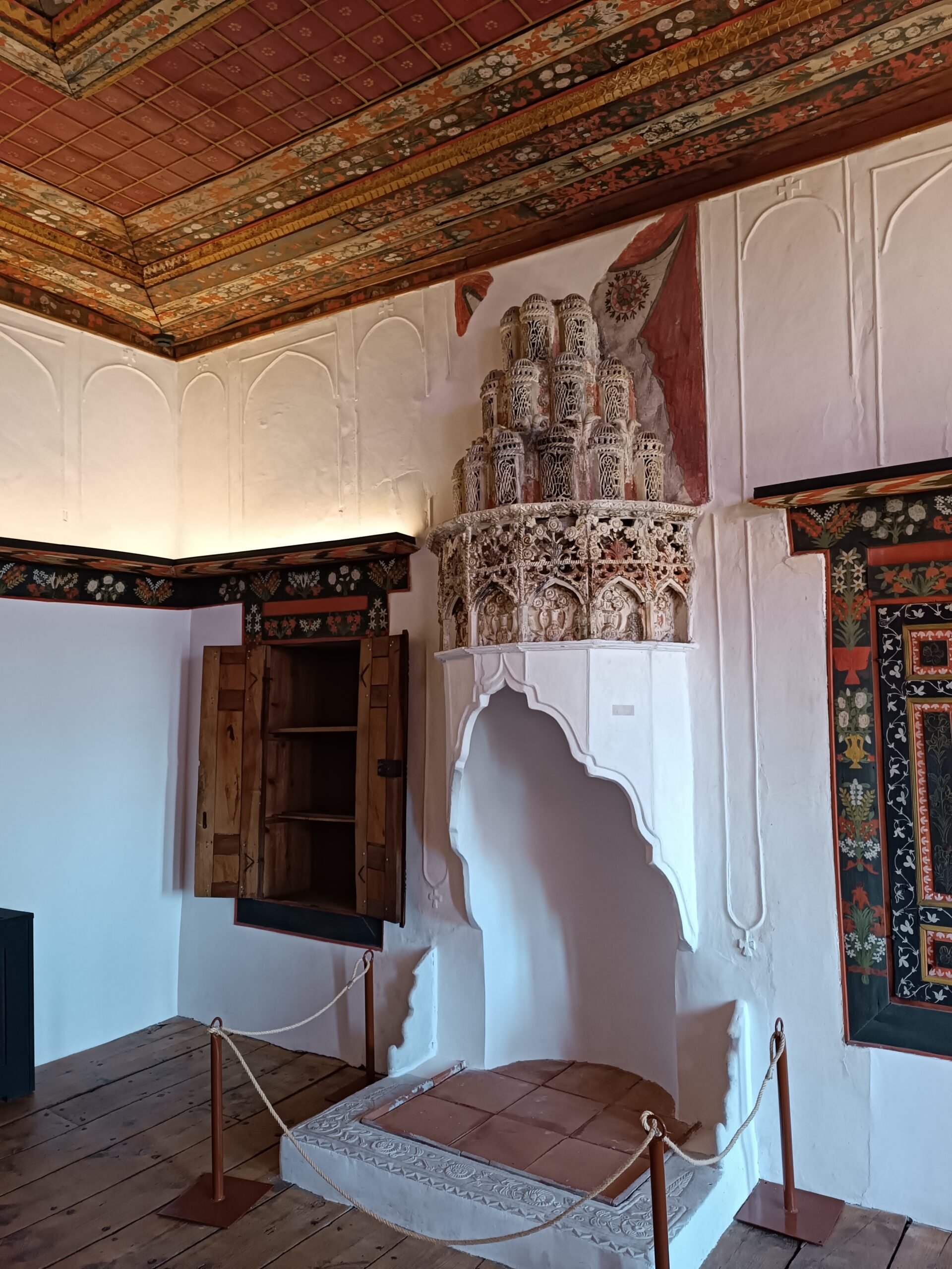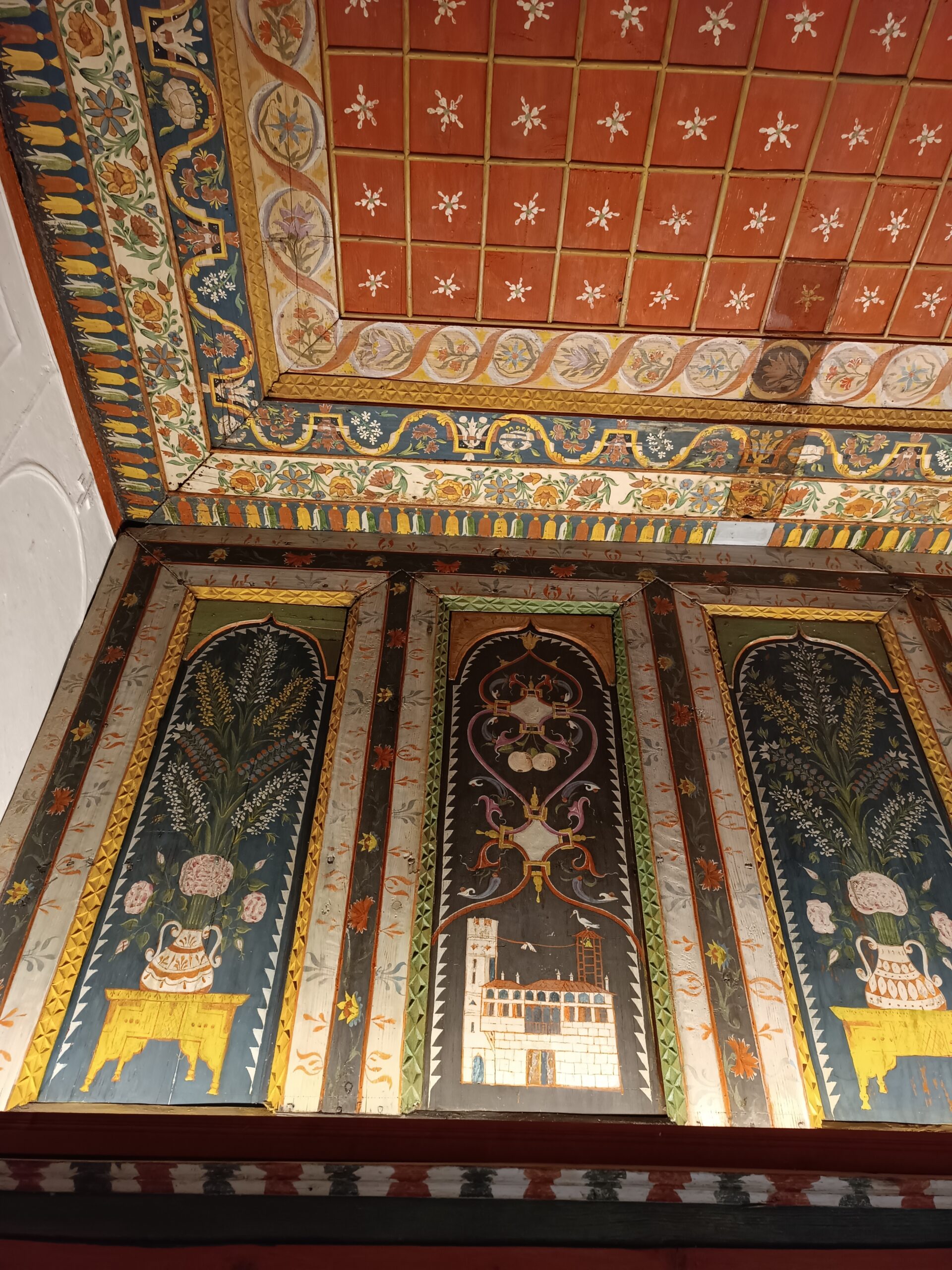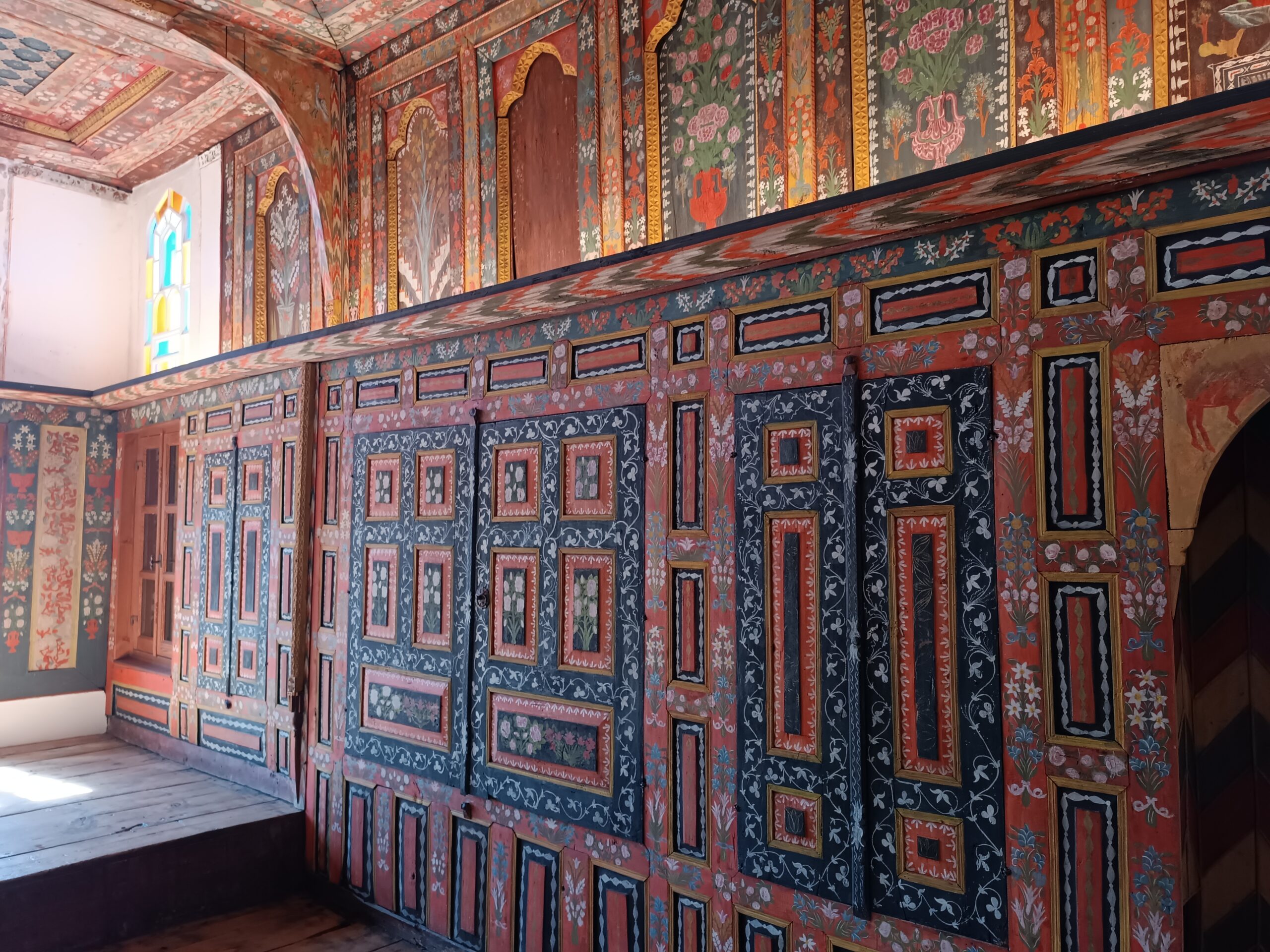 Ίσως, όμως, πιο εντυπωσιακά είναι τα σπάνια βιτρώ του αρχοντικού. Ζωγραφισμένα σε έντονα χρώματα που επιτρέπουν το λιγοστό φως της συννεφιασμένης περιοχής να διεισδύει αρμονικά στον χώρο δημιουργούν μία αίσθηση ζεστασιάς μέσα σε μία πολύχρωμη πανδαισία που γεμίζει τον χώρο. Φυτά με περίτεχνα άνθη, βυζαντινοί αετοί, θυρεοί και άλλα σύμβολα γεμίζουν τα τετραγωνισμένα βιτρώ που είναι τοποθετημένα με μαθηματική ακρίβεια ψηλά πάνω στους τοίχους.