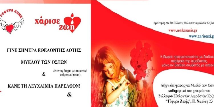 Σήμερα Παρασκευή 25/8/2017 στο Καπνοχώρι και στην Αγία Παρασκευή Κοζάνης & το Σάββατο 26/8/2017 ξανά στο Καπνοχώρι Κοζάνης ο Σύλλογος Εθελοντών Αιμοδοτών Κοζάνης «Γέφυρα Ζωής» θα παίρνει δείγμα στοματικού επιχρίσματος (δηλαδή σάλιου) στους χώρους των εκδηλώσεων.