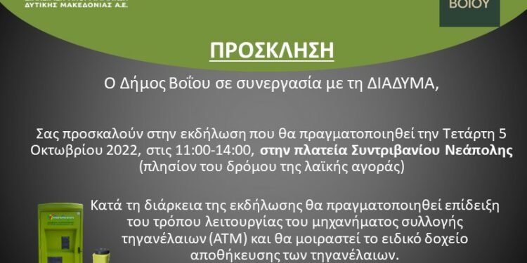 Ο Δήμος Βοΐου και η ΔΙΑΔΥΜΑ Α.Ε. προωθούν ένα νέο, καινοτόμο, σύστημα χωριστής συλλογής τηγανελαίων από νοικοκυριά. Για το λόγο αυτό την Τετάρτη 05.10.2022 και ώρα 11:00-14:00, έχει προγραμματιστεί ανοιχτή εκδήλωση ενημέρωσης των κατοίκων του Δήμου Βοΐου, στην πλατεία Συντριβανίου Νεάπολης (πλησίον του δρόμου της λαϊκής αγοράς),όπου θα δοθούν οδηγίες για τη λειτουργία του νέου συστήματος.