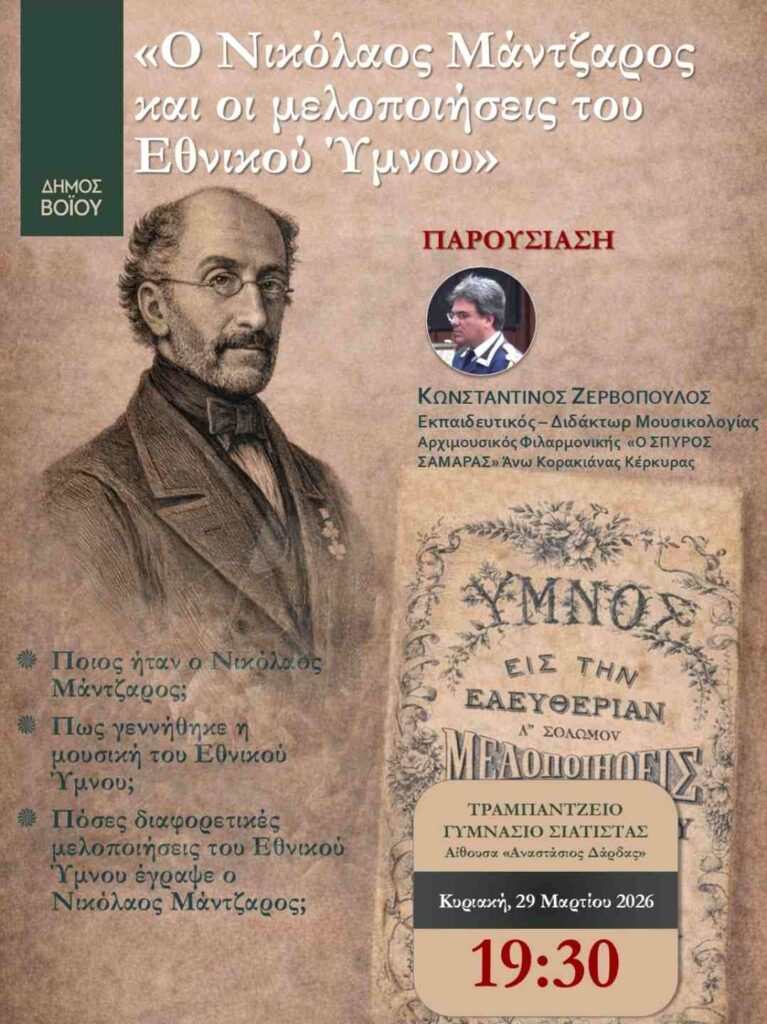 Ο Δήμος Βοΐου, στο πλαίσιο των επετειακών εκδηλώσεων για τον εορτασμό της Εθνικής Επετείου της 25ης Μαρτίου 1821, σας προσκαλεί στην εκδήλωση με τίτλο: «Ο Νικόλαος Μάντζαρος και οι μελοποιήσεις του Εθνικού Ύμνου».