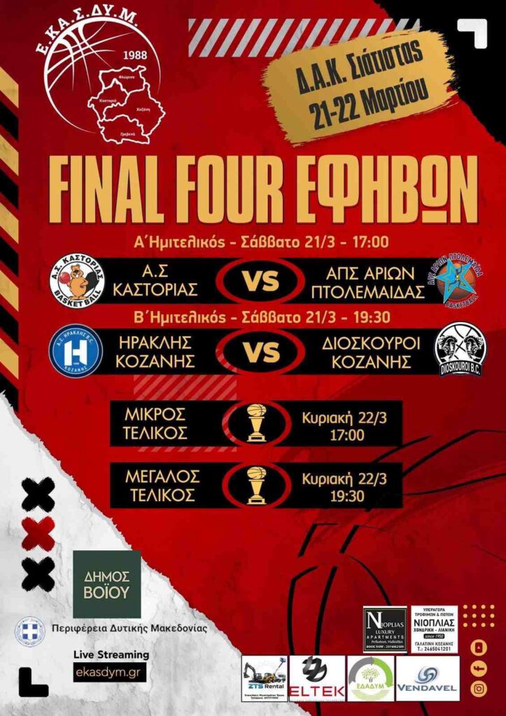 Το Final Four Εφήβων της Ε.ΚΑ.Σ.ΔΥ.Μ. θα διεξαχθεί το Σαββατοκύριακο 21 και 22 Μαρτίου στο Δ.Α.Κ. Σιάτιστας, φέρνοντας αντιμέτωπες τις τέσσερις κορυφαίες ομάδες της διοργάνωσης.