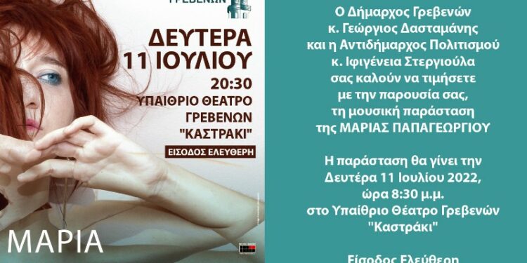 Στο πλαίσιο των θερινών πολιτιστικών εκδηλώσεων του Δήμου Γρεβενών “Πολιτιστικό Καλοκαίρι 2022”, η Δημοτική Αρχή προσκαλεί όλες και όλους να τιμήσουν με την παρουσία τους την ξεχωριστή Γρεβενιώτισσα καλλιτέχνιδα Μαρία Παπαγεωργίου, η οποία – μαζί με τους συνεργάτες της – προετοιμάζει μια μοναδική μουσική παράσταση στη γενέθλια πόλη της.