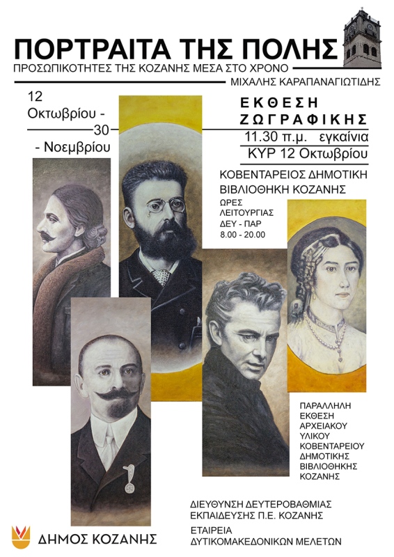 Στο πλαίσιο των Ελευθερίων της Κοζάνης, εγκαινιάζεται την Κυριακή 12 Οκτωβρίου 2025 η έκθεση ζωγραφικής «Πορτραίτα της Πόλης: Προσωπικότητες της Κοζάνης μέσα στον χρόνο» του καλλιτέχνη Μιχάλη Καραπαναγιωτίδη, η οποία θα φιλοξενείται στον χώρο περιοδικών εκθέσεων της Κοβενταρείου Δημοτικής Βιβλιοθήκης Κοζάνης (ΚΔΒΚ), με ελεύθερη είσοδο για το κοινό.