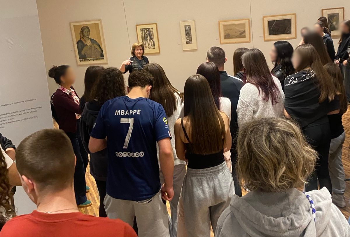 Την έναρξη των δράσεων σηματοδότησε η χθεσινή επίσκεψη τμημάτων του Ωνασείου Λυκείου, τα οποία ξεναγήθηκαν στον χώρο της έκθεσης από την κα Ματίνα Τσικριτζή – Μόμτσιου. Οι μαθητές είχαν την ευκαιρία να γνωρίσουν το έργο και την ιδιαίτερη τεχνική της καλλιτέχνιδας, προσεγγίζοντας παράλληλα το κοινωνικό και ιστορικό πλαίσιο της δημιουργίας της.