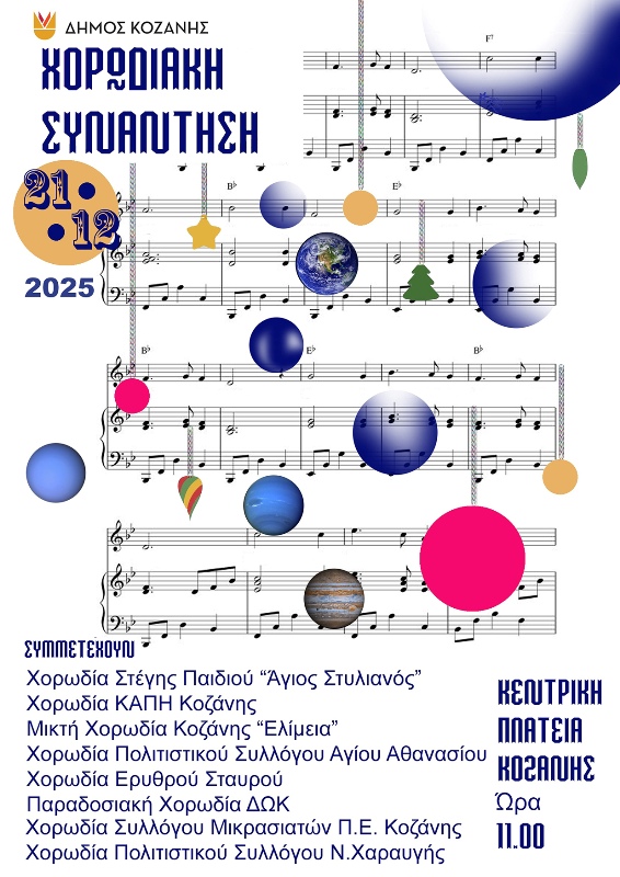 Την Κυριακή 21 Δεκεμβρίου 2025, σας προσκαλούμε στην όμορφη «Χορωδιακή Συνάντηση» που θα πραγματοποιηθεί στις 11:00 το πρωί στην κεντρική πλατεία Νίκης, στο πλαίσιο του Χριστουγεννιάτικου Προγράμματος του Δήμου Κοζάνης.