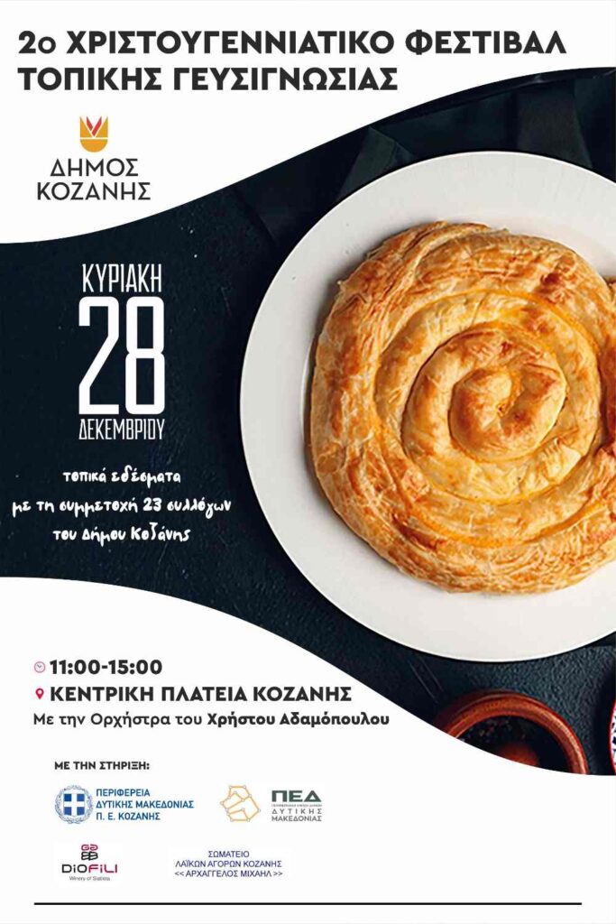 Στο πλαίσιο των Χριστουγεννιάτικων Εκδηλώσεων του Δήμου Κοζάνης, θα πραγματοποιηθεί την Κυριακή 28 Δεκεμβρίου 2025 στην κεντρική πλατεία Νίκης, από τις 11:00 το πρωί έως και τις 15:00 το μεσημέρι, το «2ο Χριστουγεννιάτικο Φεστιβάλ Τοπικής Γευσιγνωσίας», με τη συμμετοχή 23 συλλόγων του τόπου μας, που θα μαγειρέψουν νόστιμα τοπικά εδέσματα.