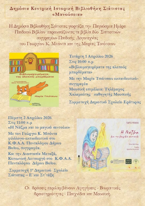 Η Δημόσια Βιβλιοθήκη Σιάτιστας γιορτάζει την Παγκόσμια Ημέρα Βιβλίου παρουσιάζοντας τα βιβλία δύο Σιατιστινών συγγραφέων Παιδικής Λογοτεχνίας του Γεωργίου Κ, Μπόντα και της Μαρίας Τσιότσιου.