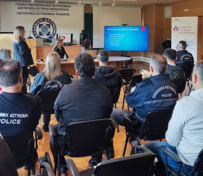 Στην αίθουσα πολλαπλών χρήσεων του Αστυνομικού Μεγάρου Κοζάνης, πραγματοποιήθηκε ενημερωτική διάλεξη με θέμα την αρτηριακή πίεση. Η εκδήλωση διοργανώθηκε από το ιατρικό προσωπικό του Κέντρου Υγείας Κοζάνης, μετά από πρόσκληση της Διεύθυνσης Αστυνομίας Κοζάνης, και είχε ως στόχο την ενημέρωση και ευαισθητοποίηση των  αστυνομικών σχετικά με τους κινδύνους της αρτηριακής υπέρτασης, τους τρόπους πρόληψης και τη σωστή διαχείριση της πάθησης.