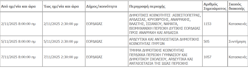 Προκειμένου να προγραμματίσετε τις εργασίες σας και να ελαχιστοποιηθεί η όχλησή σας, στον ακόλουθο πίνακα, μπορείτε να ενημερωθείτε για τις περιοχές καιτις ώρες προγραμματισμένων διακοπών ηλεκτροδότησης.