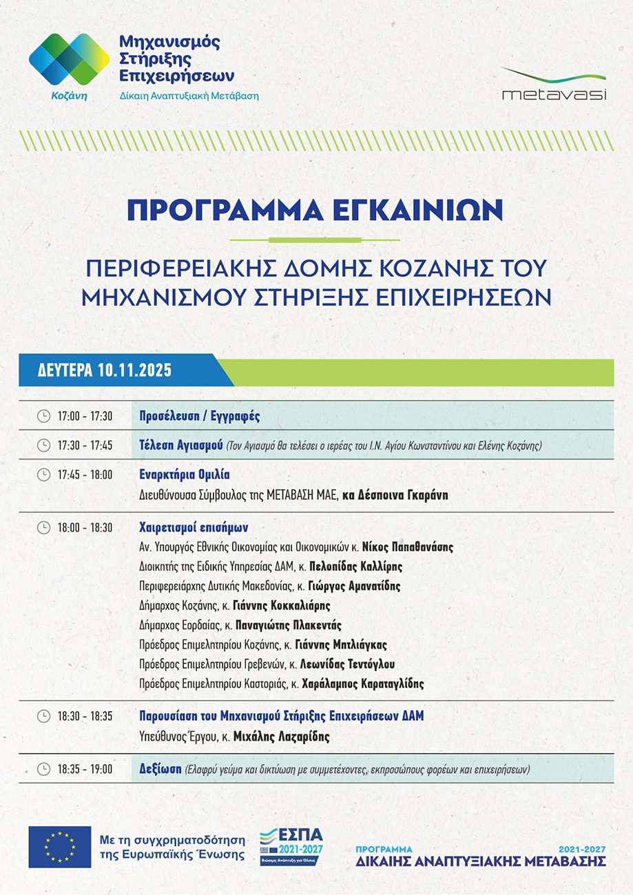 Η Ελληνική Εταιρεία Δίκαιης Αναπτυξιακής Μετάβασης (ΜΕΤΑΒΑΣΗ ΜΑΕ) σας προσκαλεί στα εγκαίνια της Περιφερειακής Δομής Κοζάνης του Μηχανισμού Στήριξης Επιχειρήσεων που εντάσσεται στο πλαίσιο του Έργου «Μηχανισμός Στήριξης Επιχειρηματικότητας για τη Δίκαιη Αναπτυξιακή Μετάβαση» και χρηματοδοτείται από το Επιχειρησιακό Πρόγραμμα Δίκαιης Αναπτυξιακής Μετάβασης ΕΣΠΑ 2021-2027.
