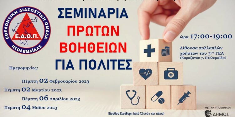 H Εθελοντική Διασωστική Ομάδα Πτολεμαΐδας ανακοινώνει ότι το Σάββατο 4 Φεβρουαρίου και την Κυριακή 5 Φεβρουαρίου 2023 θα πραγματοποιήσει υπό την αιγίδα του Ευρωπαϊκού Συμβουλίου Αναζωογόνησης (E.R.C) τέσσερα (4) πεντάωρα πιστοποιημένα σεμινάρια στην Βασική Καρδιοπνευμονική Αναζωογόνηση (B.L.S), στην χρήση Αυτόματου Εξωτερικού Απινιδωτή, στην αντιμετώπιση πνιγμονής από ξένο σώμα και στην θέση ανάνηψης.