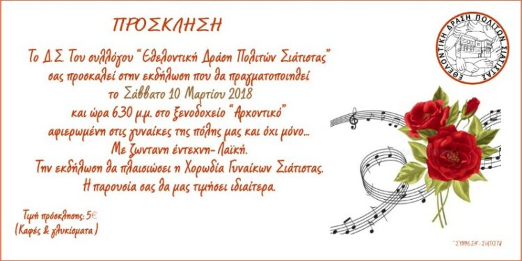 Εκδήλωση για τη γυναίκα από την εθελοντική δράση πολιτών Σιάτιστας θα πραγματοποιηθεί το Σάββατο 10 Μαρτίου στο ξενοδοχείο Αρχοντικό.