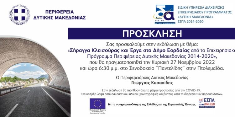 Εκδήλωση της Περιφέρειας Δυτικής Μακεδονίας με θέμα: “Σήραγγα Κλεισούρας και έργα στο Δήμο Εορδαίας από το Επιχειρησιακό Πρόγραμμα Περιφέρειας Δυτ. Μακεδονίας 2014-2022”.