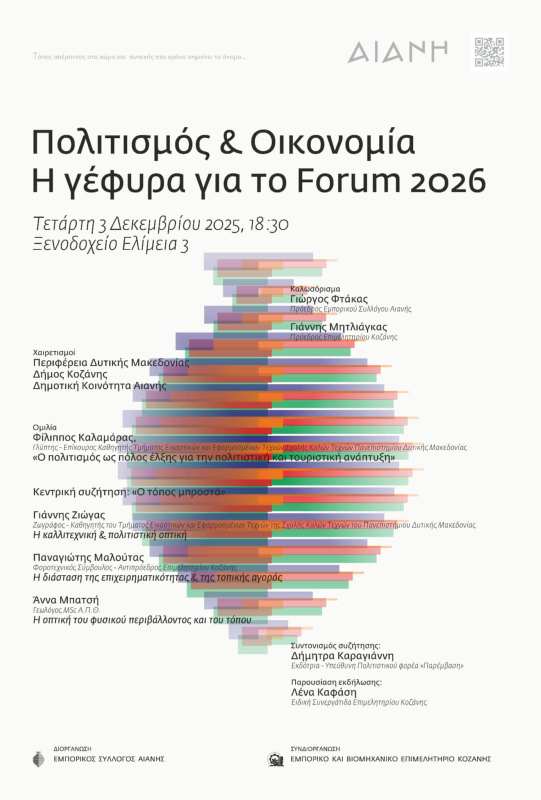 O Εμπορικός Σύλλογος Αιανής σε συνδιοργάνωση με το Επιμελητήριο Κοζάνης πρόκειται να πραγματοποιήσει εκδήλωση, την Τετάρτη 3 Δεκεμβρίου 2025, με θέμα «Πολιτισμός και Οικονομία – Η γέφυρα για το Forum 2026», η οποία έρχεται να συνδέσει δημιουργικά το περσινό επιτυχημένο Οικονομικό Forum με την προετοιμασία του Forum του 2026. Η εκδήλωση θα πραγματοποιηθεί στο ξενοδοχείο Ελίμεια 3, ώρα 6.30 μ.μ. Στόχος είναι να αναδείξει τον τρόπο με τον οποίο ο πολιτισμός, η επιχειρηματικότητα και η ταυτότητα του τόπου μπορούν να λειτουργήσουν ως ενιαίος μοχλός ανάπτυξης για τη Δυτική Μακεδονία και ειδικότερα για την περιοχή της Αιανής.