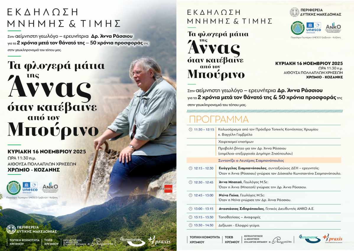 Η Περιφέρεια Δυτικής Μακεδονίας, η Τοπική Κοινότητα Χρωμίου, το Παγκόσμιο Γεωπάρκο UNESCO Γρεβενών – Κοζάνης, ο Εκπολιτιστικός και Αθλητικός Σύλλογος Χρωμίου «Η Ρωμιοσύνη», ο ΤΟΕΒ Χρωμίου, η Κοινωνική Συνεταιριστική Επιχείρηση «ΓεωΘαύμα Ελλάς» και το Ινστιτούτο Επικοινωνίας, Ανάπτυξης & Καινοτομίας +PRAXIS, διοργανώνουν εκδήλωση μνήμης και τιμής προς την αείμνηστη Γεωλόγο – ερευνήτρια Δρ. Άννα Ράσσιου για τα 50 χρόνια προσφοράς στη Γεωκληρονομιά του τόπου μας και τα 2 χρόνια από τον θάνατό της, με θέμα: