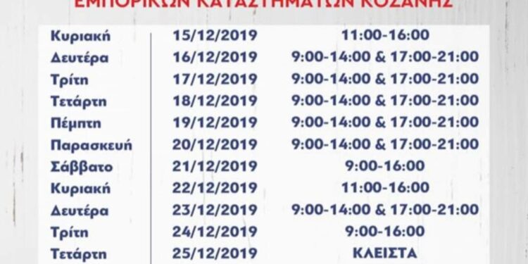 Αναλυτικά το προτεινόμενο ωράριο από τον Εμπορικό Σύλλογο Κοζάνης: