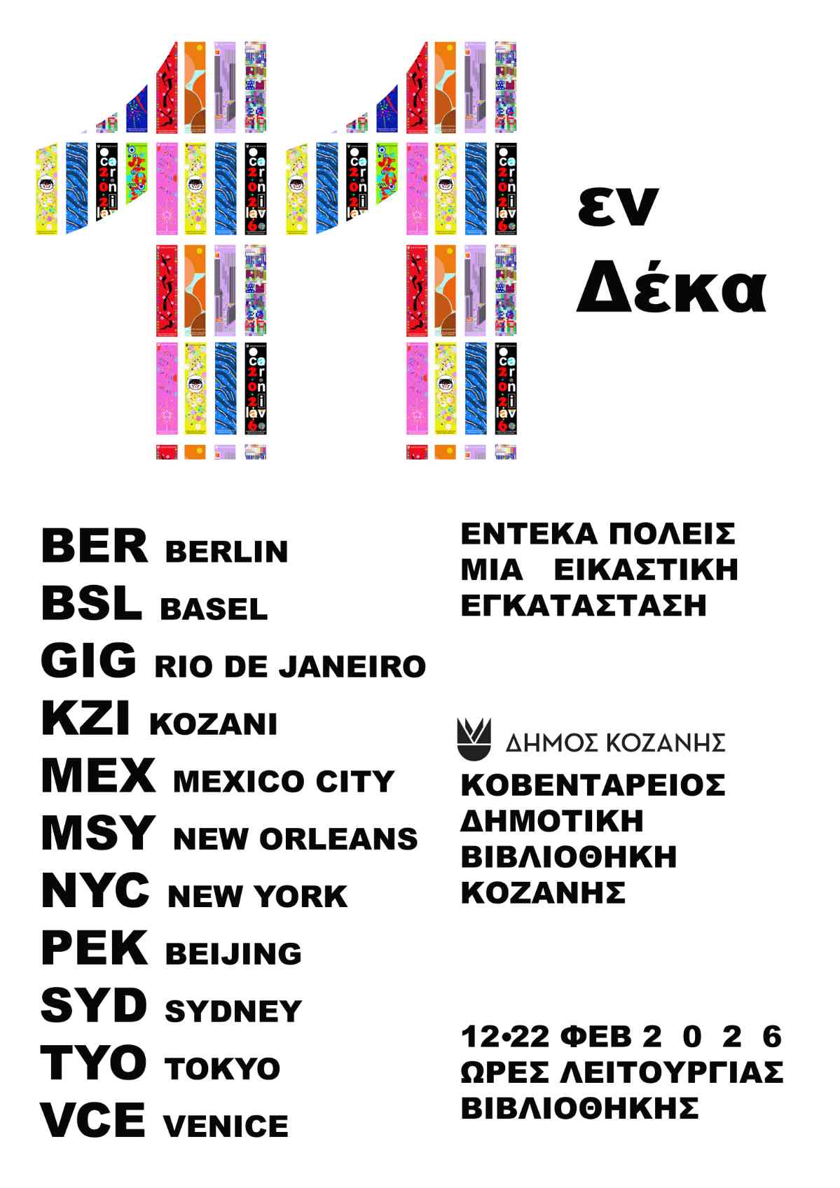 Αυτή τη χρονιά με αφορμή τον εορτασμό της Κοζανίτικης Αποκριάς συναντώνται νοητά δια μέσου των εικόνων και του βιβλίου κάτω από μία κοινή στέγη. Η Κοβεντάρειος Δημοτική Βιβλιοθήκη Κοζάνης συμμετέχει σε αυτόν τον εορτασμό με μία εικαστική εγκατάσταση στο φουαγιέ και την παιδική βιβλιοθήκη εμπνευσμένη από την Κοζανίτικη Αποκριά και το καρναβάλι δέκα πόλεων ανά τον κόσμο, συνδυάζοντας εικόνες, φωτογραφίες, επιλεγμένα βιβλία τέχνης και αρχειακό υλικό.