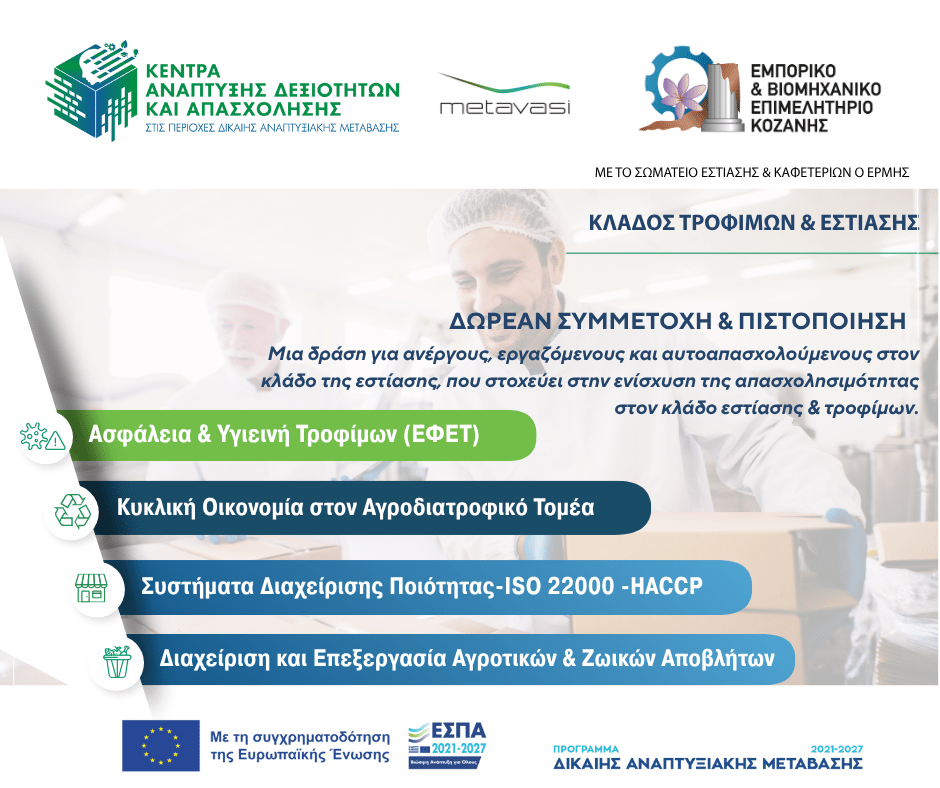 Το Εμπορικό & Βιομηχανικό Επιμελητήριο Κοζάνης, σε συνεργασία με τη Μετάβαση Μ.Α.Ε. και το Σωματείο Καφετεριών & Εστίασης Κοζάνης «Ο Ερμής», ανακοινώνει την υλοποίηση μιας νέας εκπαιδευτικής πρωτοβουλίας για τον κλάδο Τροφίμων & Εστίασης, στο πλαίσιο των Κέντρων Ανάπτυξης Δεξιοτήτων και Απασχόλησης στις Περιοχές Δίκαιης Αναπτυξιακής Μετάβασης.