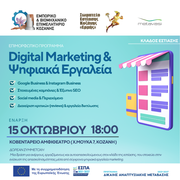 Το Επιμελητήριο Κοζάνης, σε συνεργασία με το Σωματείο Καφετεριών και Εστίασης Κοζάνης «Ο Ερμής» και με την υποστήριξη των Κέντρων Ανάπτυξης Δεξιοτήτων Κοζάνης, προχωρά στην έναρξη ενός νέου, σύγχρονου επιμορφωτικού προγράμματος με τίτλο «Digital Marketing & Ψηφιακά Εργαλεία στην Εστίαση», το οποίο εντάσσεται στο πλαίσιο των επιμορφωτικών δράσεων των Κέντρων Δεξιοτήτων.
