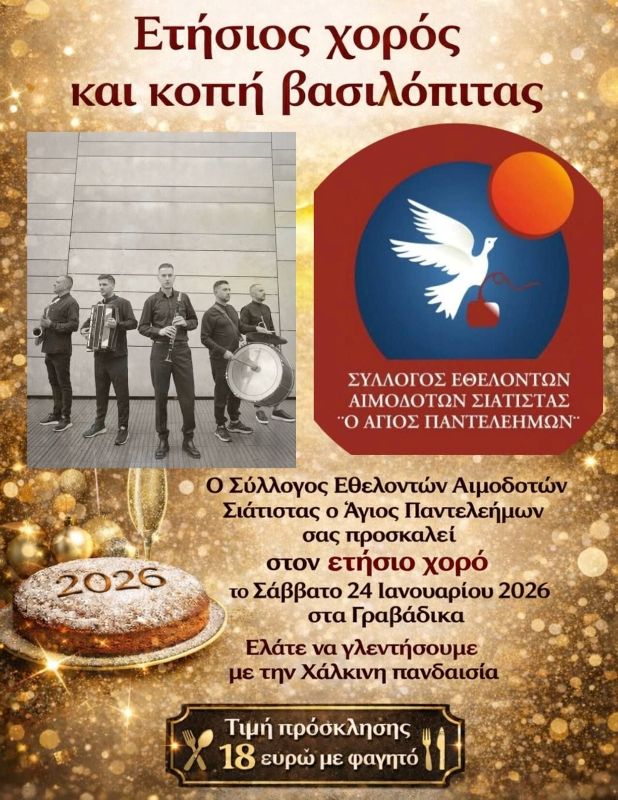 Ο Σύλλογος Εθελοντών Αιμοδοτών Σιάτιστας ο Άγιος Παντελεήμων θα πραγματοποιήσει τον ετήσιο χορό του αλλά και την κοπή της βασιλόπιτας, το Σάββατο 24 Ιανουαρίου 2026, στις 8.30 το βράδυ στα Γραβάδικα στη Σιάτιστα.