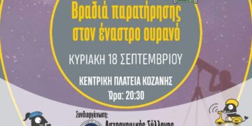 Την Κυριακή 18 Σεπτεμβρίου, στις 20.30, στην Κεντρική Πλατεία Κοζάνης, θα παρατηρήσουμε τον Κρόνο και τον Δία μέσα από τα τηλεσκόπια των μελών του Συλλόγου.