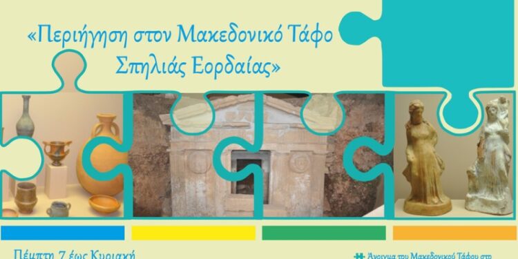 Η εκδήλωση, υπό τον γενικό τίτλο «Περιήγηση στον Μακεδονικό Τάφο Σπηλιάς Εορδαίας», θα πραγματοποιηθεί από την Πέμπτη 7 έως και την Κυριακή 10 Ιουνίου 2018 και κατά τις ώρες 10.00 π.μ. – 14.00 μ.μ.