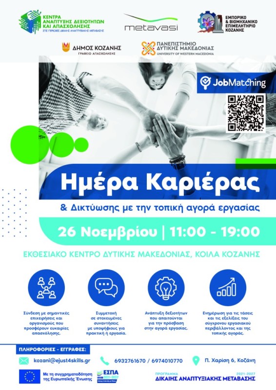 Η Μετάβαση Μ.Α.Ε., σε συνεργασία με το Επιμελητήριο Κοζάνης, διοργανώνουν την Ημέρα Καριέρας & Δικτύωσης με την τοπική αγορά εργασίας, την Τετάρτη 26 Νοεμβρίου 2025, από τις 11:00 έως τις 19:00, στο Εκθεσιακό Κέντρο Δυτικής Μακεδονίας στα Κοίλα Κοζάνης.