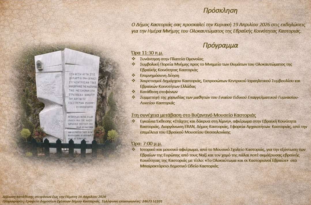 Ο Δήμος Καστοριάς θα πραγματοποιήσει την Κυριακή 19 Απριλίου 2026 εκδηλώσεις για την Ημέρα Μνήμης του Ολοκαυτώματος της Εβραϊκής Κοινότητας Καστοριάς.