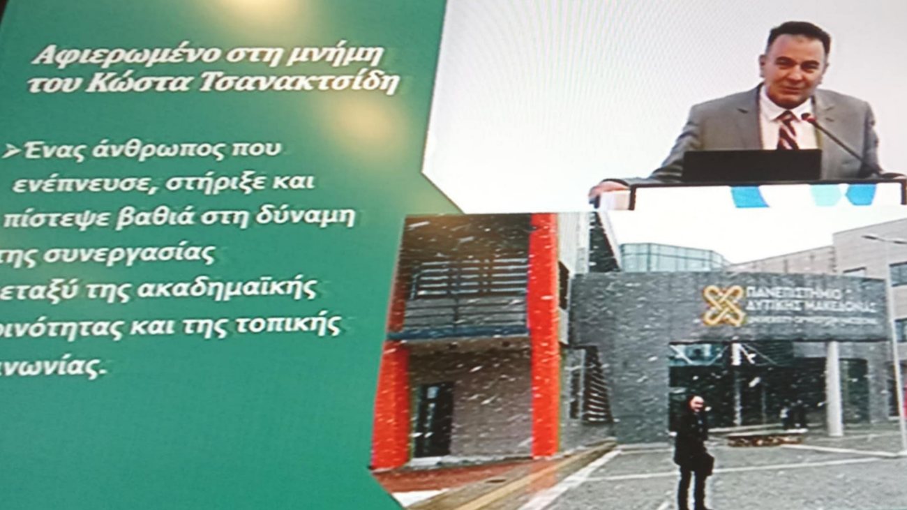 Η εκδήλωση ήταν αφιερωμένη στη μνήμη του Καθηγητή κ. Κώστα Τσανακτσίδη, Διευθυντή του Μεταπτυχιακού Προγράμματος «Ενεργειακές Επενδύσεις και Περιβάλλον» του Πανεπιστημίου Δυτικής Μακεδονίας, ο οποίος υπήρξε αρωγός και εμπνευστής στην ίδρυση του ΣΥΝ.ΚΕ.ΔΥ.Μ. και καθοδηγητική μορφή για μια ολόκληρη γενιά νέων επιστημόνων.