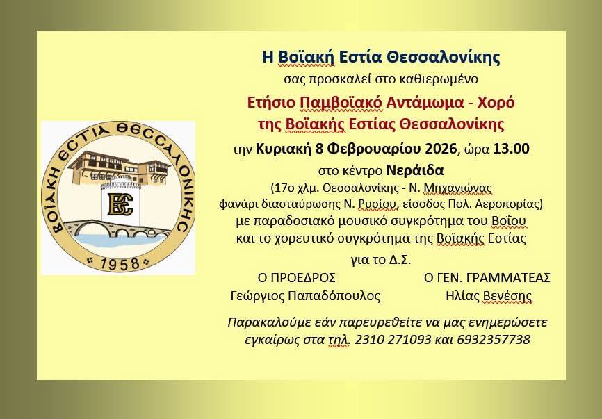 Η Βοϊακή Εστία Θεσσαλονίκης σας προσκαλεί στο καθιερωμένο Ετήσιο Παμβοϊακό Αντάμωμα – Χορό της Βοϊακής Εστίας Θεσσαλονίκης.