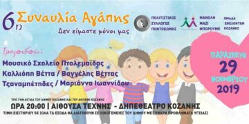 Ο Πολιτιστικός Σύλλογος Ποντοκώμης, η Οργάνωση ΄΄Μανώλη Μαζί Μπορούμε ΄΄και η Ομάδα Εθελοντών Κοζάνης υπό την αιγίδα του Δήμου Κοζάνης και του Δηπεθε Κοζάνης διοργανώνουν την 6η Συναυλία Αγάπης σήμερα Παρασκευή 29 Νοεμβρίου 2019 και ώρα 20:00, στην Αίθουσα Τέχνης.