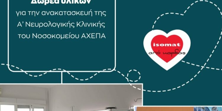 Για το λόγο αυτό, ο Όμιλος ISOMAT βρίσκεται κοντά στα νοσοκομεία της χώρας και ανταποκρίνεται άμεσα στις ανάγκες τους με ποικίλες δράσεις προσφοράς όλα αυτά τα χρόνια. Έτσι, για ακόμα μια φορά, ανταποκρίθηκε άμεσα στην έκκληση του Διευθυντή της Ά Νευρολογικής Κλινικής ΑΠΘ, Βασίλειου Κιμισκίδη, για προσφορά των δομικών υλικών για την ανακατασκευή και τον εκσυγχρονισμό των κτιριακών εγκαταστάσεων της ‘Α Νευρολογικής Κλινικής του Νοσοκομείου ΑΧΕΠΑ.
