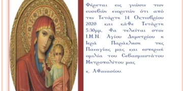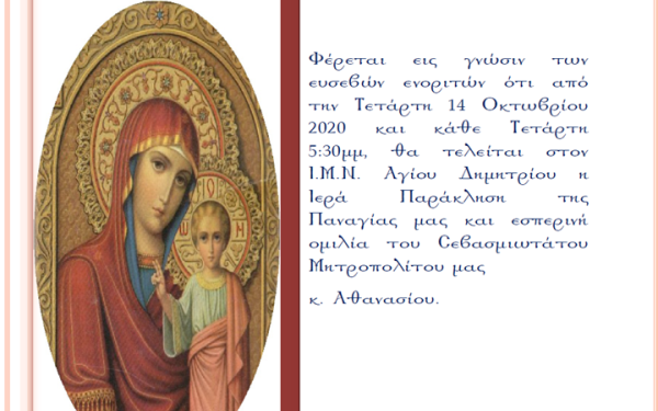 Ιερά Παράκληση προς την Υπεραγία Θεοτόκο την Τετάρτη 14 Οκτωβρίου και κάθε Τετάρτη στον Ι.Μ.Ν. Αγίου Δημητρίου.