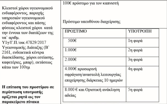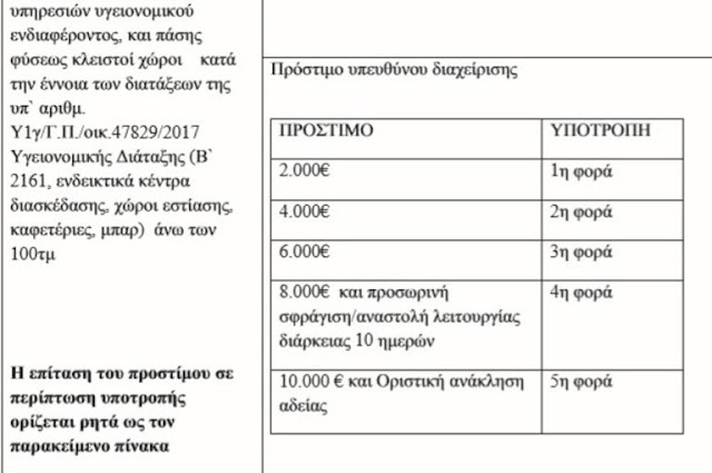 Αυτό που δεν αλλάζει είναι ότι για όλες τις παραπάνω περιπτώσεις παραμένει στα 500 ευρώ το πρόστιμο για τον υπεύθυνο διαχείρισης ή προϊστάμενο εκτός από τα καταστήματα υγειονομικού ενδιαφέροντος πάνω από 100 τ.μ.