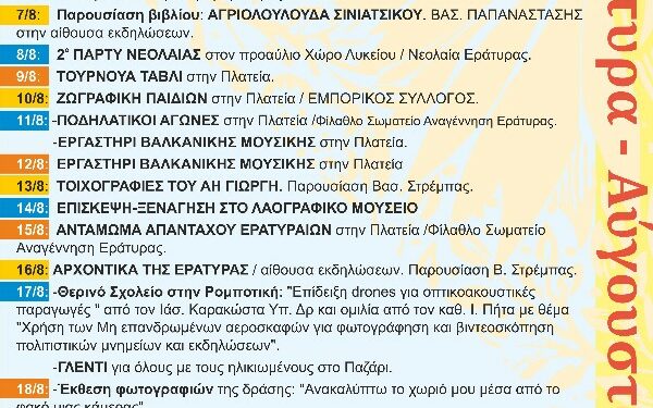 Παρουσίαση βιβλίου στις 7/8 από τον καθ. Β.Παπαναστάση, ομιλίες στην αίθουσα εκδηλώσεων για τα Αρχοντικά της Εράτυρας, αλλά και για τη χρήση και συμβολή της τεχνολογίας DRONE στον πολιτισμό.