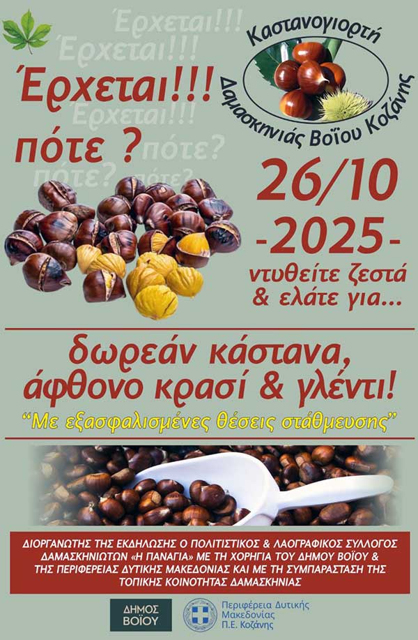 Έρχεται η μεγάλη Καστανογιορτή στη Δαμασκηνιά Βοΐου την Κυριακή 26 Οκτωβρίου 2025