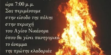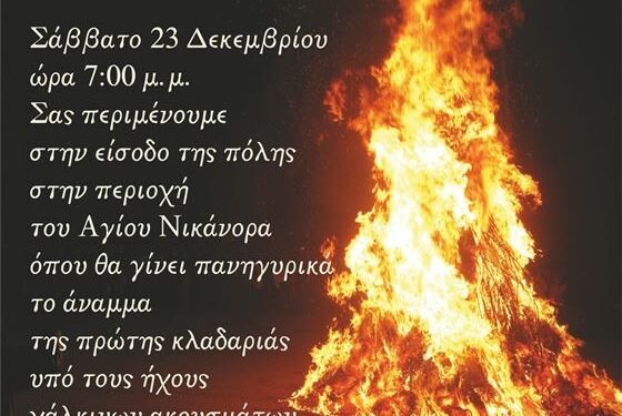 Το Σάββατο 23 Δεκεμβρίου 2017 σας περιμένουμε στην είσοδο της πόλης στην περιοχή του Αγίου Νικάνορα όπου θα γίνει πανηγυρικά το άναμμα της πρώτης κλαδαριάς υπό τους ήχους χάλκινων ακουσμάτων.