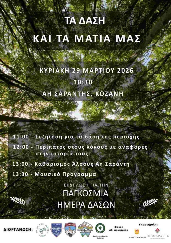 Με αφορμή την Παγκόσμια Ημέρα Δασών, η Οικολογική Κίνηση Κοζάνης, ο Φανός Αγίου Δημητρίου, η Διεύθυνση Δασών Κοζάνης, οι ορειβατικοί σύλλογοι Ε.Ο.Σ. και Σ.Ε.Ο. Κοζάνης και το Πρότυπο Δάσος Δυτικής Μακεδονίας (Western Macedonia Model Forest), διοργανώνουν δράσεις με τίτλο: Τα Δάση και Τα μάτια μας.