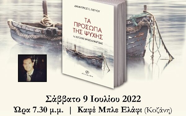 Παρουσίαση του βιβλίου «Τα πρόσωπα της ψυχής – 16 Ιστορίες ψυχοθεραπείας» του Δημητρίου Σ. Πέτρου από τις Εκδόσεις Παρέμβαση θα γίνει το Σάββατο 9 Ιουλίου, στις 7:30 μ.μ., στο καφέ «Μπλε Ελάφι» (Π. Μελά 42).