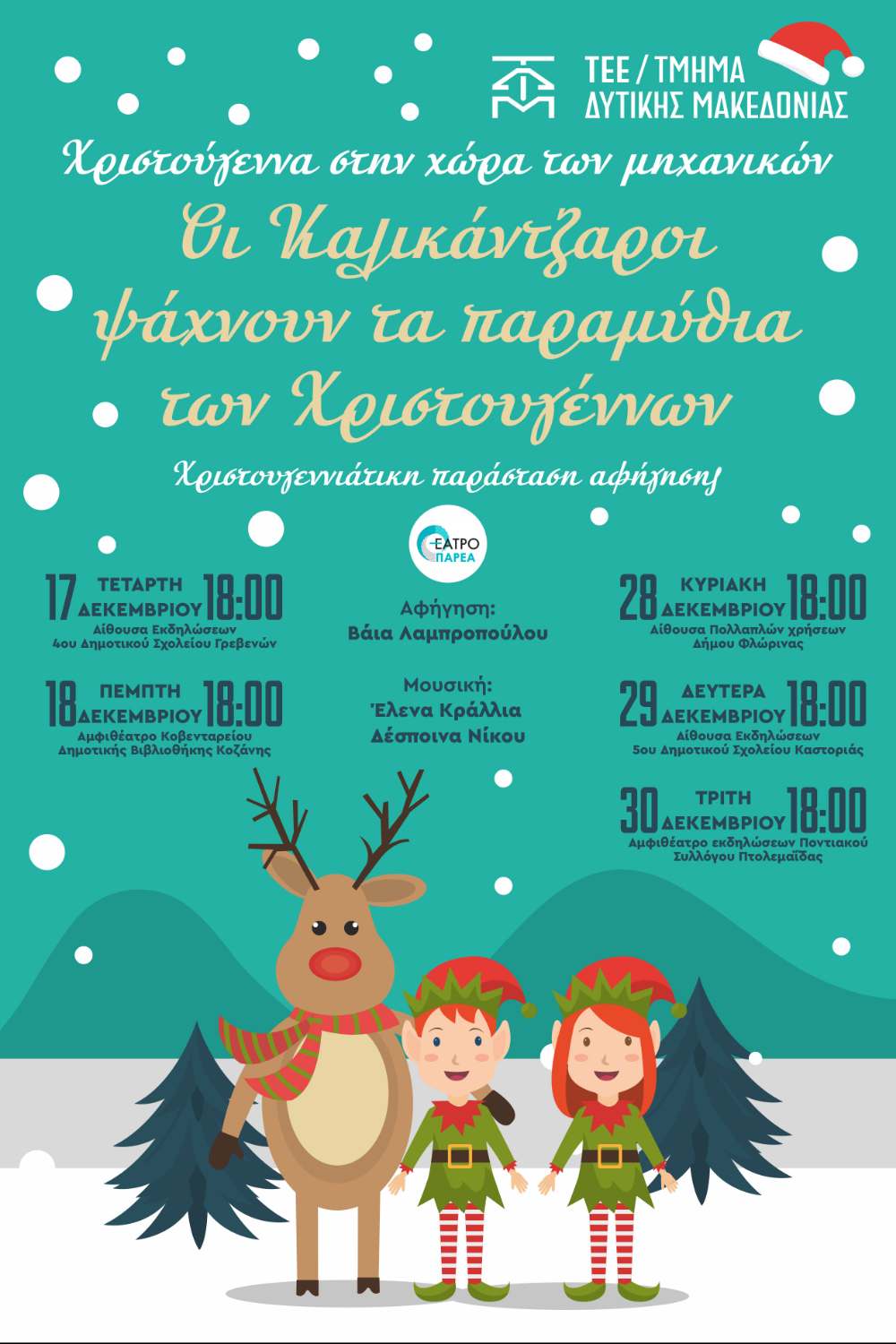 Το Τεχνικό Επιμελητήριο Ελλάδας – Τμήμα Δυτικής Μακεδονίας προσκαλεί τα παιδιά των μηχανικών – μελών του ΤΕΕ σε μια ξεχωριστή χριστουγεννιάτικη παράσταση αφήγησης, αφιερωμένη στους μικρούς φίλους της μεγάλης οικογένειας των μηχανικών.