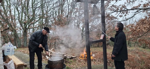 Έξω, όμως, η ζωή είχε ήδη πάρει τον δρόμο της. Η φωτιά έκαιγε δυνατά και το μεγάλο καζάνι έβραζε τις τσιγαρίδες, σκορπίζοντας μυρωδιές που θύμιζαν παλιά πανηγύρια και χειμώνες αλλοτινούς. Στις ψησταριές, τα λουκάνικα ψήνονταν σιγά σιγά, με τους άντρες να γυρίζουν τα κάρβουνα και να πειράζονται μεταξύ τους, ενώ οι γυναίκες ετοίμαζαν τα τραπέζια και τα κρασιά και το τυροκομείο «ζηκος» ετοίμαζε πιατέλες με τυριά.