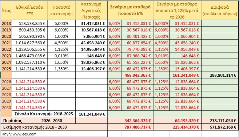 Όπως αποτυπώνεται και στον σχετικό πίνακα, αν το ποσοστό κατανομής παρέμενε στο 6% από το 2018 έως το 2030, τότε, ακόμη και με πολύ μετριοπαθείς προβλέψεις, τα συνολικά έσοδα για τις λιγνιτικές περιοχές θα άγγιζαν τα 800 εκατ. ευρώ.