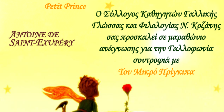 Ο Σύλλογος Εκπαιδευτικών Γαλλικής Γλώσσας Ν. Κοζάνης, έχοντας την ευθύνη διάχυσης των αξιών του Διεθνούς Οργανισμού Γαλλοφωνίας, προσκαλεί μαθητές και μαθήτριες όλων των βαθμίδων του νομού μας σε Μαραθώνιο Ανάγνωσης για τη Γαλλοφωνία με θέμα: Ο Μικρός Πρίγκιπας, του Αντουάν ντε Σαιντ Εξυπερύ.