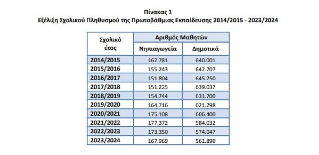 Στον πίνακα 1 απεικονίζεται η εξέλιξη του σχολικού πληθυσμού νηπιαγωγείων και δημοτικών από το σχολικό έτος 2014/2015 έως το σχολικό έτος 2023/2024.