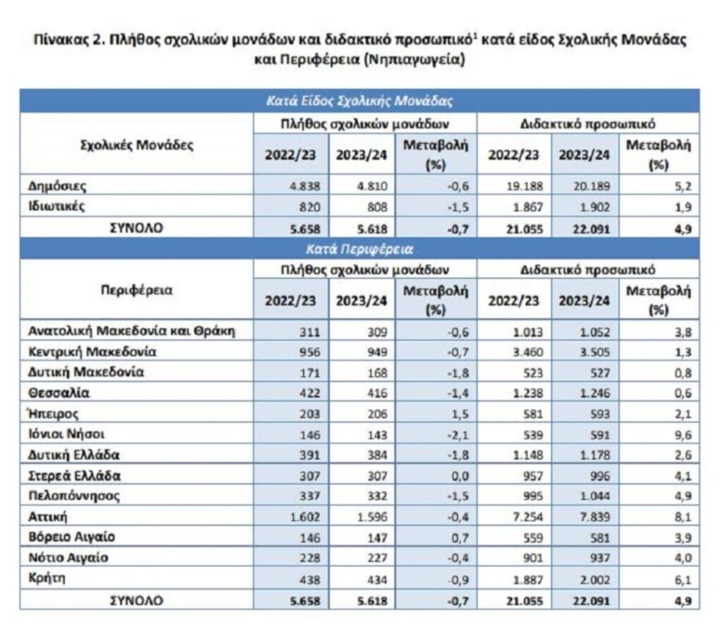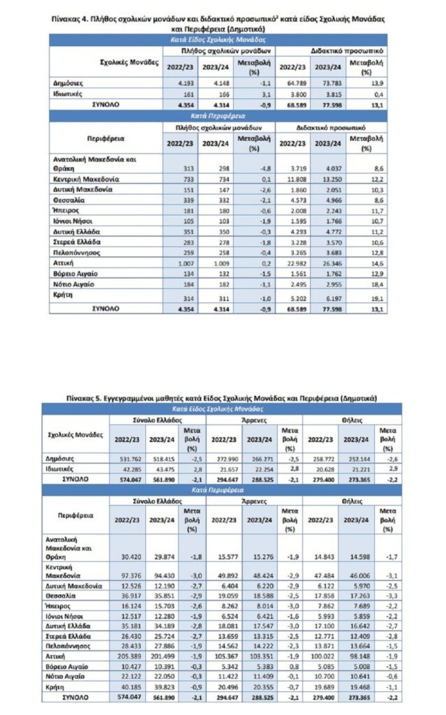 Η Ελληνική Στατιστική Αρχή (ΕΛΣΤΑΤ) ανακοινώνει τα στοιχεία που αφορούν στις στατιστικές Πρωτοβάθμιας Εκπαίδευσης (νηπιαγωγεία και δημοτικά) του σχολικού έτους 2023/2024.