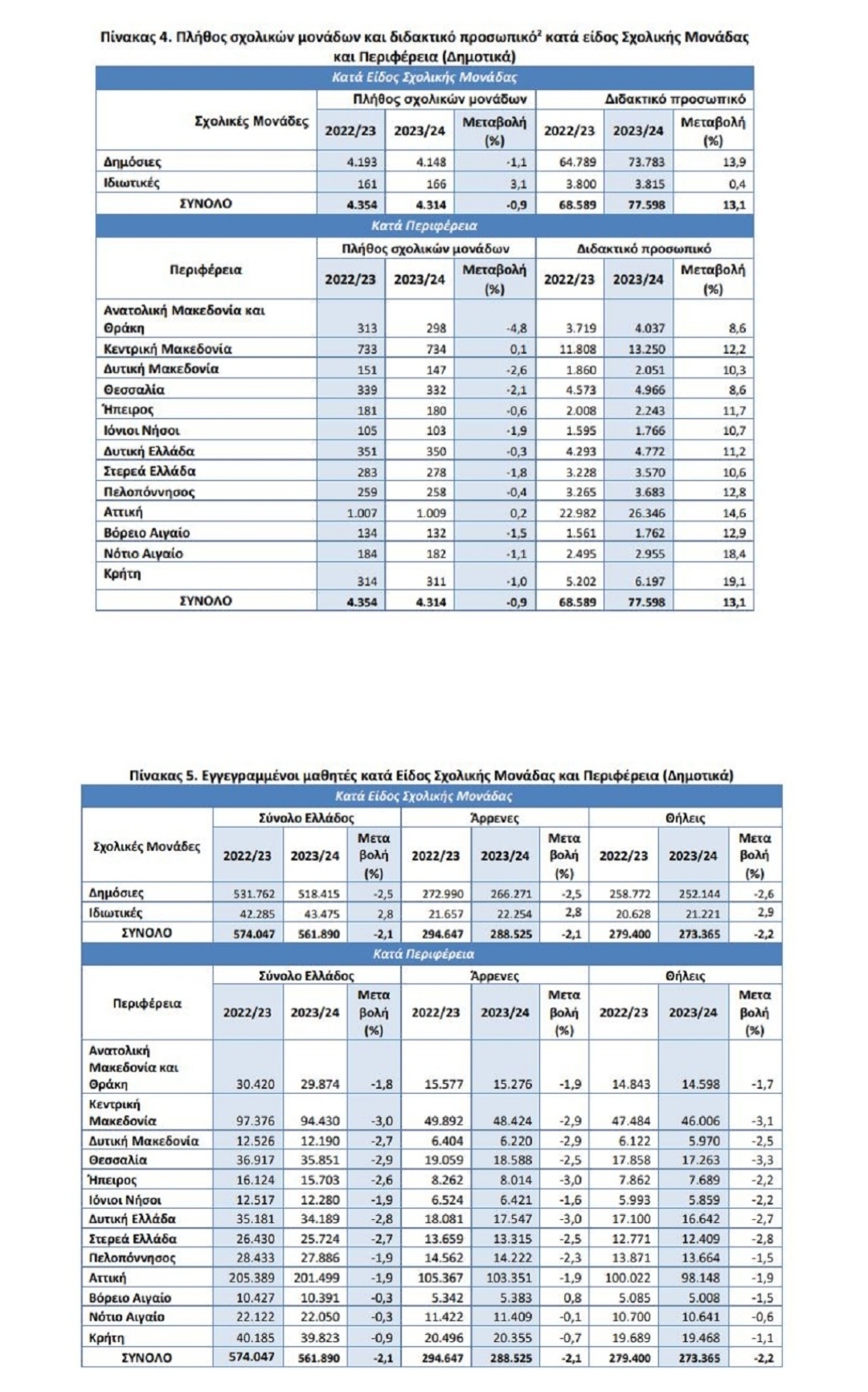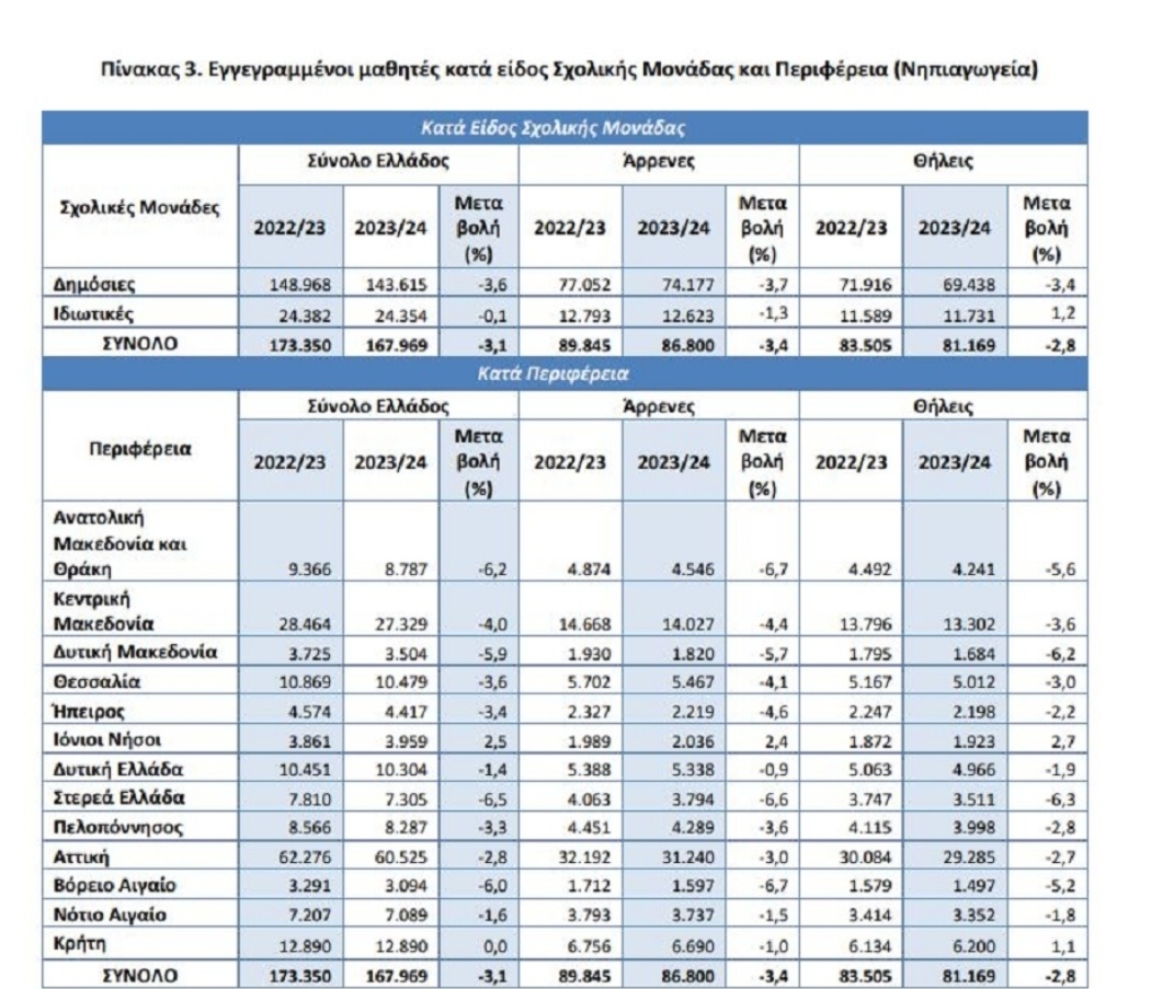 γ) Οι εγγεγραμμένοι μαθητές κατά το σχολικό έτος 2023/2024, σε σχέση με το 2022/2023, παρουσίασαν μείωση κατά 3,1% στα νηπιαγωγεία και κατά 2,1% στα δημοτικά (πίνακες 2 και 4 αντίστοιχα).